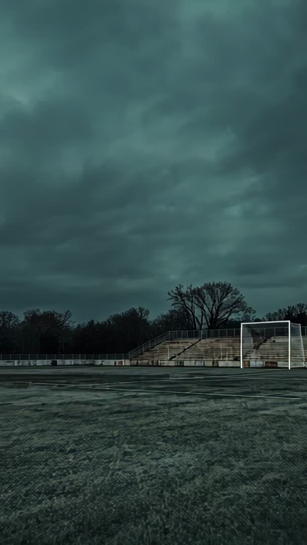 AI Generated Image. Vertical video capturing drifting clouds over frost-covered soccer pitch at dawn with empty goal frame and deserted bleachers. Cool teal tones and textured frozen turf creating moody, cinematic atmosphere, slow cloud movement adding tension and calm simultaneously. Composition emphasizing negative space with low horizon and expansive sky, suiting use as background for titles, intros, social media reels, and atmospheric promos. Optimized for mobile platforms and portrait reels, fitting opening scene for sports documentary, backdrop for music video, overlay for weather segment, hero banner for outdoor apparel campaign, or visual for meditation and solitude-themed content.