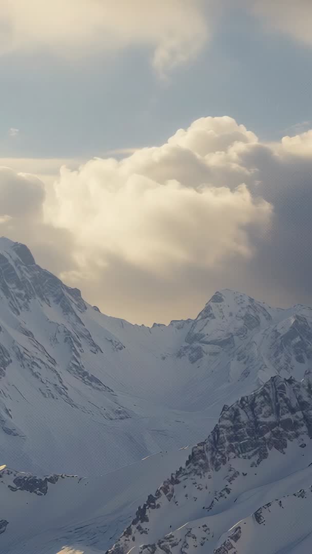 AI Generated Image. Drifting cumulus cloud moving across snow-filled alpine valley, shedding wisps of vapor into warm golden sky. Snow-covered peaks framing deep glacial bowl and providing strong scale and contrast against soft cloud mass. Vertical composition capturing slow cloud movement and expansive mountain depth, with subtle atmospheric haze and gentle backlight. Working well for vertical social media reels, weather segments, travel promos, nature documentaries, and meditation or relaxation apps. Providing calm background for mobile wallpapers, welcome screens, hero banners, and on-screen transitions. Color palette featuring cool blues and neutral whites with warm golden highlights for sunrise or sunset mood. Suggested edits include slow pan or gentle parallax, subtle zoom, soft color grade to enhance warmth, and ambient sound design or minimal piano underscore for emotive storytelling.