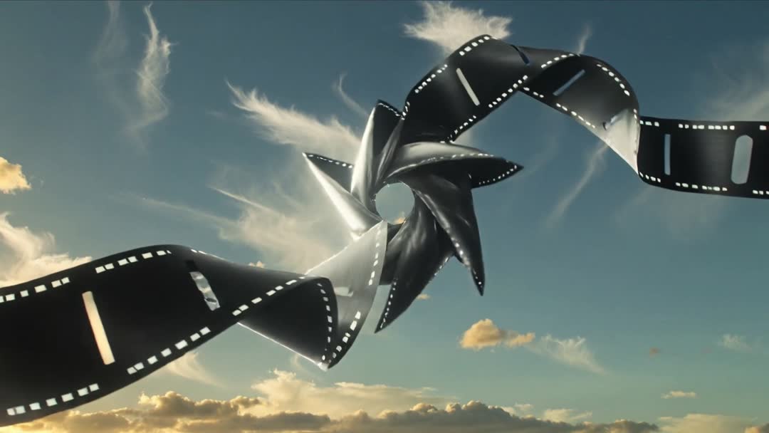 - Drifting Filmstrip Spiral Forming Glowing Cyan Aperture Over Sunset Sky Cinematic Motion Loop