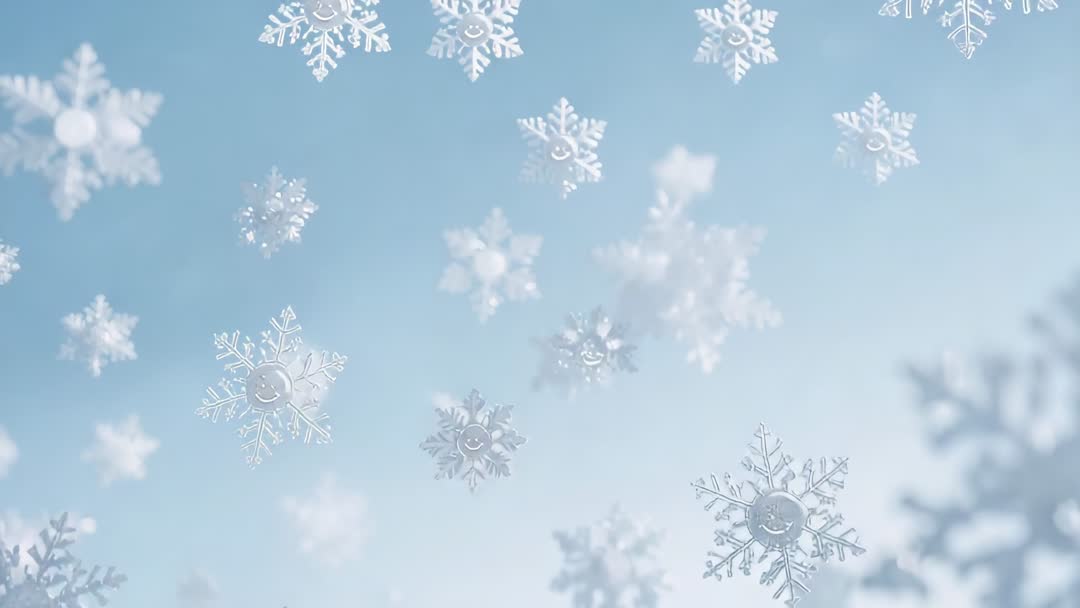 AI Generated Video. Drifting ornate snowflakes with intricate lattice patterns gliding across soft gradient blue sky, creating calm wintry atmosphere. Gentle bokeh highlights adding depth and subtle sparkle while smiling centers introduce whimsical charm. Seamless looping motion making clip ideal for video backgrounds, holiday intros, weather graphics, social media reels, website headers, greeting card animations, and product promos. Suitable for overlay with text or logos, leaving negative space in upper area for titles and captions. Color grading suggestions: cooler blue tones for serene moods or warmer accents for cozy holiday feel. Use for seasonal marketing, festive websites, broadcast packages, digital signage, and animated greeting designs.