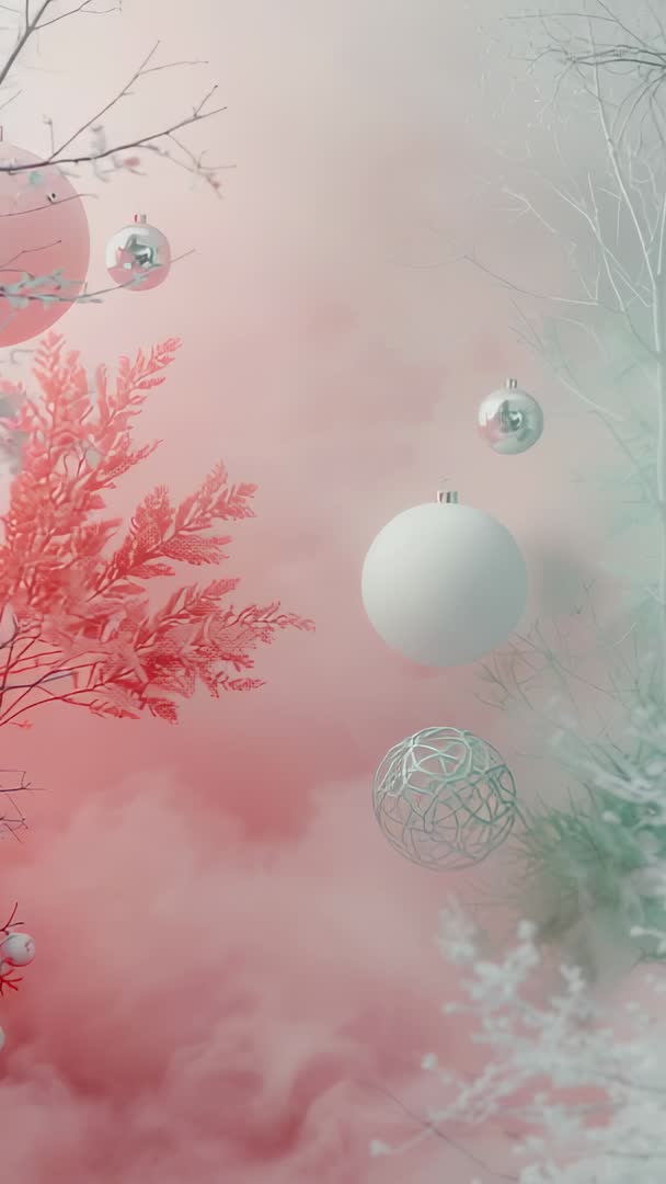 - Drifting ornaments and frosted twigs in pastel pink mist holiday vertical video
