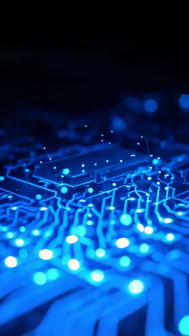 AI Generated Image. Vertical footage showing camera drifting over blue circuit board and zooming into microchip while animated data pulses traversing circuit traces. Visual language emphasizing connectivity, high-speed data transfer, modern electronics. Content working well for tech product promos, cybersecurity presentations, software demos, AI and machine learning marketing, data center visuals, electronic engineering tutorials, corporate technology backgrounds, mobile app intros. Footage performing well in vertical social media ads, smartphone wallpapers, trade show displays, website hero sections, explainer videos. Color palette dominating electric blue and deep black, creating futuristic mood. Shots providing room for text overlays and logo placement near top and bottom. Usage suggestions include integrating into technology campaigns, enhancing startup pitch decks, supporting instructional videos, enriching broadcast segments about innovation and digital infrastructure.