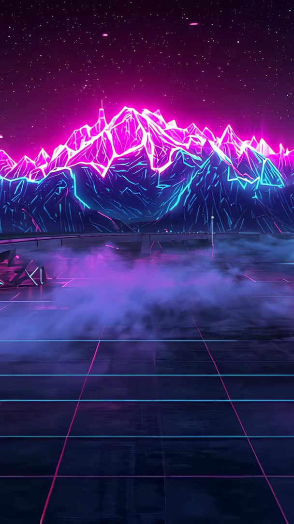 AI Generated Video. Footage showing drifting purple fog revealing neon pink and cyan ridge above glowing grid, with metal bridge crossing mid-ground under starry night. Visual style combining synthwave color palette, low-poly mountain geometry, glowing edge lines, and reflective grid floor. Use ideas include backgrounds for music videos, vertical ads for streaming platforms, smartphone wallpapers, social media reels, and livestream overlays. Editing tips include adding overlay text in upper third, applying slow crossfade for smooth transitions, trimming to loopable 10-15 second segments, and boosting magenta and cyan contrast for punchy neon look. Suitable for retro tech campaigns, synth music promotions, game intros, futuristic product launches, and concept art showcases. Vertical 9:16 frame providing extra space for mobile-first storytelling and portrait-oriented compositions.