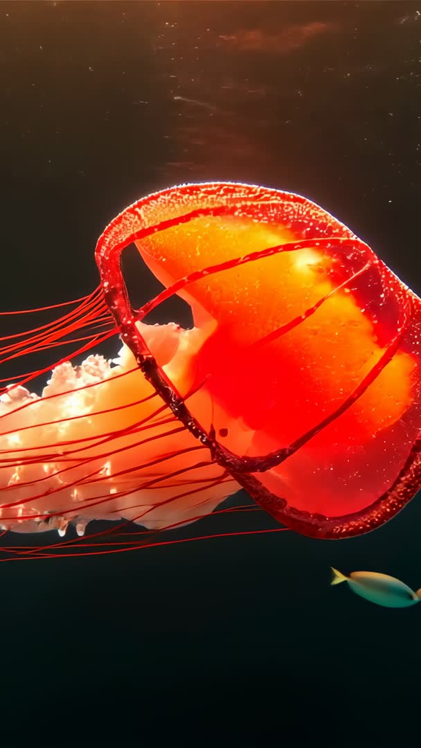 AI Generated Image. Showing drifting red jellyfish pulsing under warm overhead light in dark aquarium tank. Featuring translucent bell, long streaming tentacles, subtle bioluminescent glow and small tropical fish passing nearby. Vertical 9:16 framing making clip ideal for mobile social media stories, reels and vertical ads. Offering vibrant orange-red color palette, high contrast silhouette against deep water, smooth slow-motion motion and cinematic close-up detail. Useful for nature documentaries, aquarium promotion, museum exhibit signage, educational videos on marine biology, environmental campaigns and calming background loops for wellness apps. Licensing ready for editorial use, commercial ads, digital banners and motion design projects requiring striking underwater visuals.