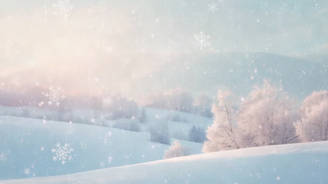 AI Generated Video. Drifting snowflakes sweeping across pastel sky while sunrise glow rises from left, gently illuminating frost-covered trees on rolling snow fields. Camera slowly panning across wide winter panorama, creating tranquil, dreamy mood with soft bokeh snowfall and muted pastel color palette. Footage showing shallow depth of field for cinematic foreground snowflakes and distant frosted ridgelines. Ideal for pairing with ambient music for relaxation videos or meditation apps, overlaying text and logo for seasonal greetings and holiday commercials, using as opener or background for travel and tourism campaigns showcasing winter countryside. Suitable for looping as website hero background, virtual event backdrop, social media stories and reels, or cropping to vertical aspect for mobile ads and reels. Color grading options include warming for golden hour feel or cooling for crisp minimalist winter motifs. Useful for broadcast, streaming, web, and branded content seeking serene winter atmosphere.