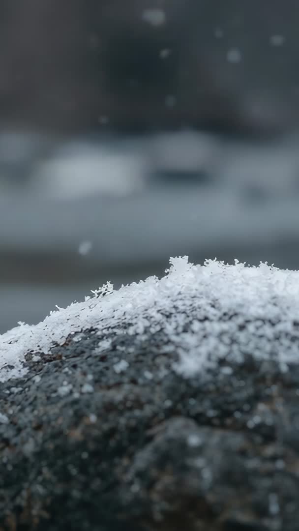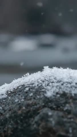 AI Generated Video. Vertical clip showing drifting snowflakes settling on frosted rock at roadside under overcast sky. Closeup focus capturing crystalline flakes and granular frost creating textured foreground while background remains soft and blurred. Slow, calming motion conveying cold winter atmosphere and muted blue-gray palette. Working well for seasonal advertising, weather reports, travel reels, mobile wallpapers, social media vertical ads, title backgrounds, calming B-roll, nature sequences, and environmental documentaries. Easy to loop for continuous background, simple to color grade for cinematic delivery, and optimized for 9:16 mobile-first projects.