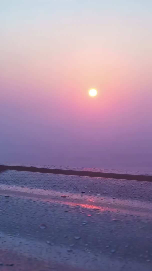 AI Generated Image. Video showing drifting sun casting soft pink and purple glow while light is reflecting on wet railing and surface droplets. Vertical composition emphasizing height and leading lines created by railing and reflective sheen, with misty horizon blending into pastel sky. Mood conveying calm, romance, early morning serenity with gentle color gradient. Vertical format optimized for mobile and social platforms, providing cinematic loopable footage for backgrounds and intros. Usage ideas: mobile wallpaper and lockscreen, Instagram Reels and TikTok backgrounds, travel and resort promos, wellness and meditation app intros, website hero banners and full-screen headers, cinematic overlays for music videos and ambient playlists, advertising for coastal lifestyle and hospitality brands. Post-production suggestions: looping for seamless playback, color grading for warmer or cooler tone, adding ambient ocean soundscape or soft piano to enhance mood.