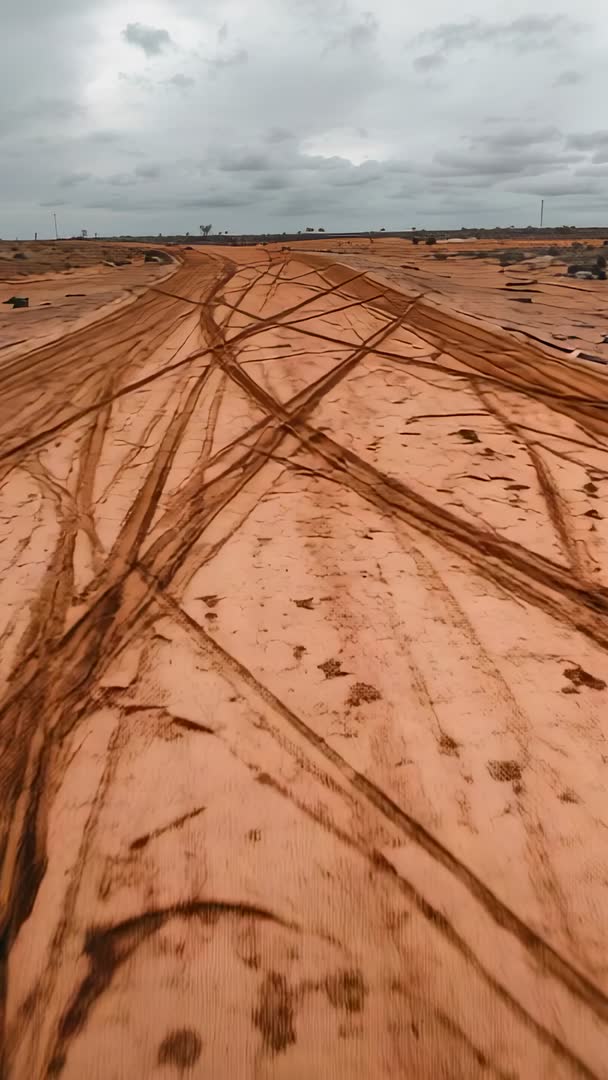 AI Generated Video. Vertical video showing 4x4 driving across red sandy desert plain under cloudy sky, leaving crisscrossed tire tracks in loose sand. Camera following low-angle path, emphasizing motion, texture, and vast landscape. Serving as dynamic B-roll for adventure travel promos, off-road vehicle commercials, overlanding blogs, social media reels, and documentary sequences. Pairing with energetic soundtrack or ambient wind sound to enhance sense of speed and isolation. Useful for illustrating rugged exploration, remote travel stories, desert landscapes, road trip narratives, and vehicle testing footage.