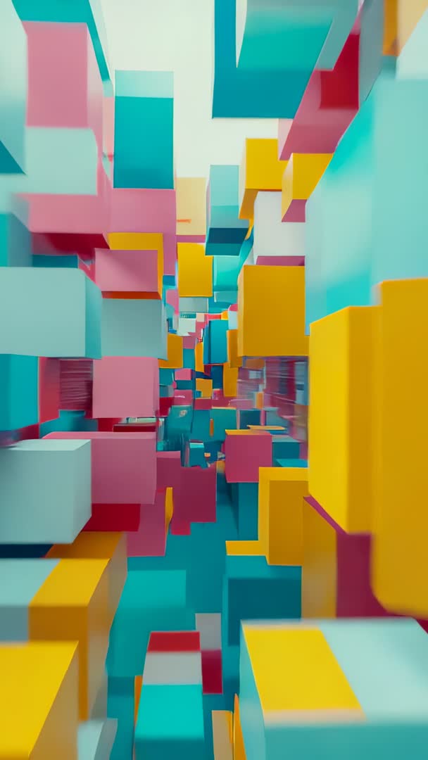 AI Generated Image. Vertical 4K video showing camera driving forward through tunnel of floating multicolored cubes. Colors featuring cyan, pink, yellow creating vibrant, playful mood. Motion remaining smooth with shallow depth of field and subtle motion blur, creating sense of speed and depth. Suited for looping backgrounds, social vertical ads, app intros, music visualizers, VJ performances, technology promos, title sequences. Working well as overlay behind product shots or text, adding dynamic geometric movement and color pop. Recommending syncing cuts to beat, adding electronic or synth soundtrack, placing headlines near center or upper third to avoid cube occlusion. Allowing color grading to match brand palette and looping for seamless playback.