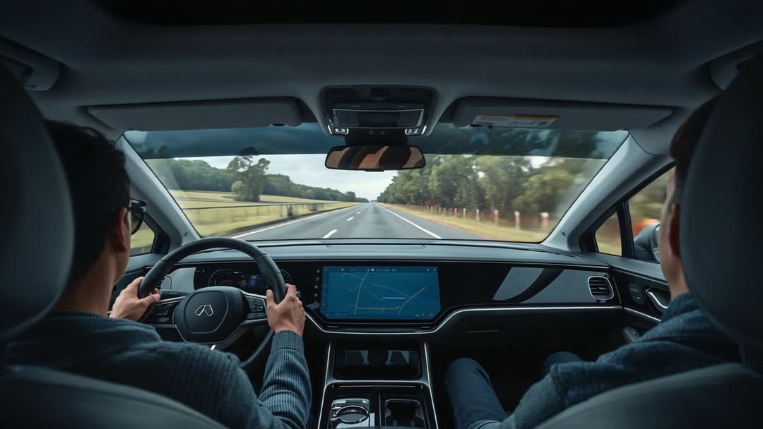 AI Generated Image. Video clip showing driver wearing glasses and ribbed sweater steering on straight rural highway while passenger sitting in front seat looking forward through windshield. Dashboard touchscreen displaying map and active route guidance, center console and instrument cluster visible. Countryside fields and trees passing by outside, creating sense of motion and open-road freedom. Composition emphasizing hands on wheel, lane-centered driving, and in-car navigation technology. Use for automotive commercials, navigation technology demos, road safety campaigns, ride-sharing and mobility app promotions, travel and lifestyle videos, corporate fleet presentations, website hero banners, brochure spreads. Editing suggestions: add lower-third copy over dashboard area, place logo in top-left corner, crop for 16:9 and 4:5 ratios, color grade warm tones for lifestyle or cool tones for tech, animate map overlay on touchscreen for emphasis, slow outside scenery for cinematic opener. Technical notes: daytime exterior lighting, steady rear-seat vantage capturing dashboard-to-road perspective, subjects wearing casual sweaters and glasses for relatable lifestyle feel.