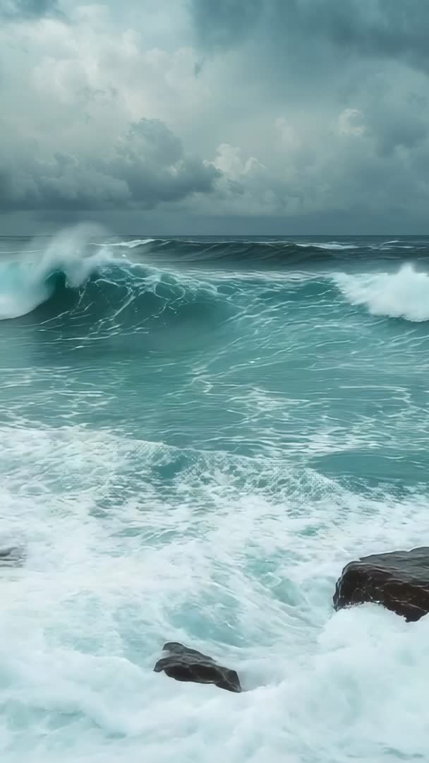 AI Generated Image. Vertical video showing storm winds driving teal-green waves into cresting breakers and frothy white foam against dark rocky shore. Overcast sky and low horizon creating moody, dramatic atmosphere and sense of scale. Foreground rocks receiving pounding surf while midground waves are cresting and breaking, sending spray and turbulent water toward camera. Color palette featuring cool teal and steel-gray tones. Working well for weather reports, storm warnings, news packages, travel and adventure promos, coastal conservation and climate change stories, social media vertical ads, mobile wallpapers, cinematic title sequences, and ambient relaxation clips. Editing suggestions: applying slow motion to emphasize spray and curl, boosting contrast and desaturating warm tones to heighten mood, layering ambient ocean sound or dramatic music, placing bold text in upper sky area for headlines or call-to-action, ensuring safe crop margins for 9:16 distribution. Deliverable: vertical 9:16 footage ideal for mobile-first platforms and short-form video campaigns.