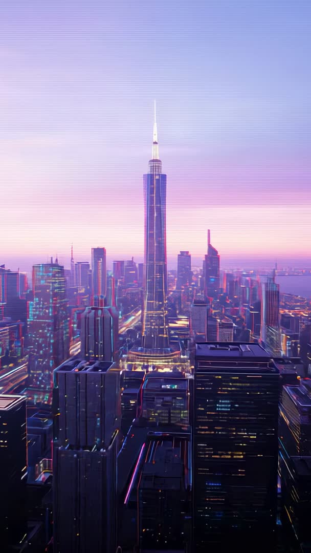 AI Generated Video. Vertical drone video starting with wide city skyline and approaching central neon-lit tower at dusk. Camera framing tower with symmetrical composition while pastel cyan and magenta sky glowing. Neon reflections sliding across glass facades and traffic trails adding motion and depth. Useful for technology commercials, architecture showcases, urban travel promos, futuristic film openers, real estate marketing, corporate backgrounds, broadcast packages, social media reels and mobile wallpapers. Editing suggestions: slow push-in edit, color grade to boost cyan and magenta tones, add ambient synth or cinematic pad, sync cuts to beat for dynamic opener, crop for 9:16 vertical platforms. Deliverable suggestions: 4K vertical masters, loopable clip for background use, short teaser cuts for Instagram Reels and TikTok.
