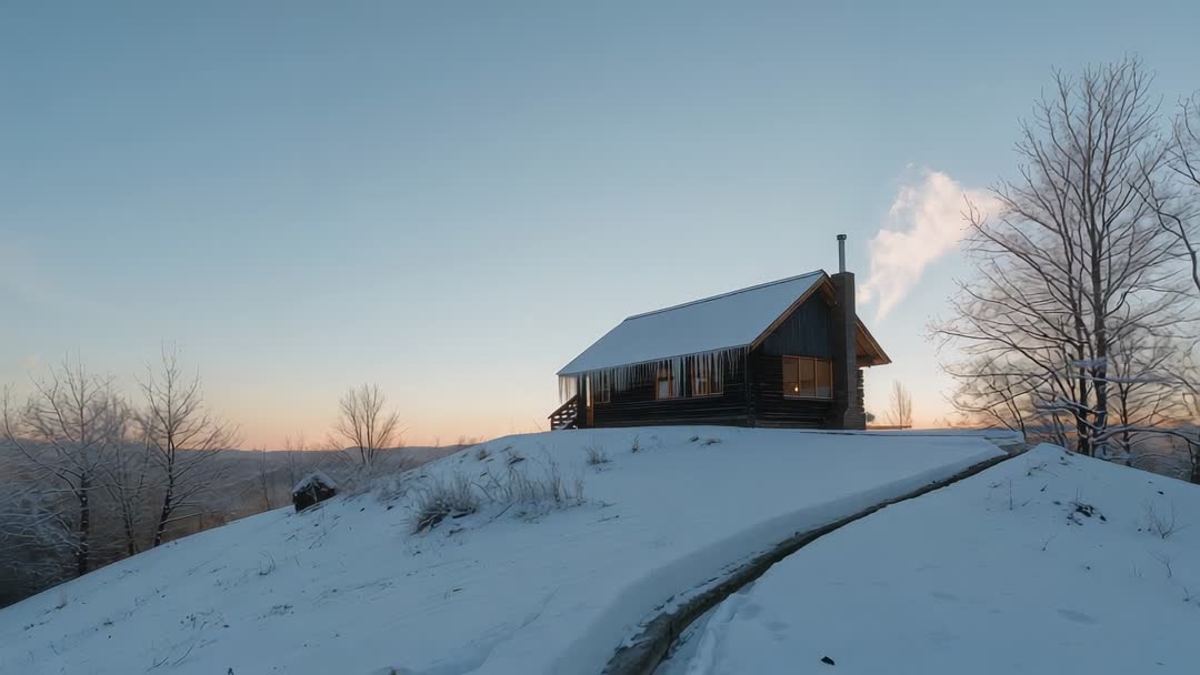AI Generated Video. Drone footage showing close approach to snowy wooden cabin on hilltop at sunrise, with chimney smoke drifting into morning sky and windows glowing with warm light. Icicles hanging from eaves and frost covering nearby trees, suggesting cold outdoor air and cozy indoor warmth. Scene working well for travel video openers, winter tourism promos, cabin rental listings, holiday marketing, and lifestyle storytelling about solitude or slow living. Footage useful for documentary inserts about rural life, environmental sequences, desktop backgrounds, and social media reels. Editing suggestions: apply gentle warm-cool color contrast, use slow push-in camera move, add ambient wind and subtle fireplace crackle for richer atmosphere. Aspect ratio flexibility making footage suitable for widescreen promos, vertical reels, and background plates.