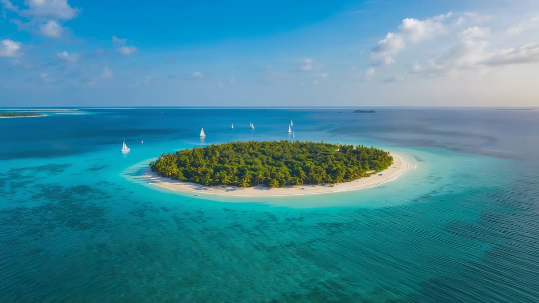 AI Generated Video. Video showing aerial drone approaching tropical islet surrounded by vivid turquoise lagoon, white sand beach, and dense palm canopy. Sailboats circling outer reef while shallow coral formations and sandbars revealing through crystal-clear water. Smooth cinematic motion creating immersive establishing shots and close reveal sequences, ideal for travel promos, resort commercials, destination websites, social media reels, and TV advertising. Color grading suggestions including boosting turquoise saturation, enhancing palm texture contrast, and applying slight warm tint for golden hour mood. Licensing uses including tourism campaigns, sailing and charter marketing, environmental conservation stories, and lifestyle editorial.