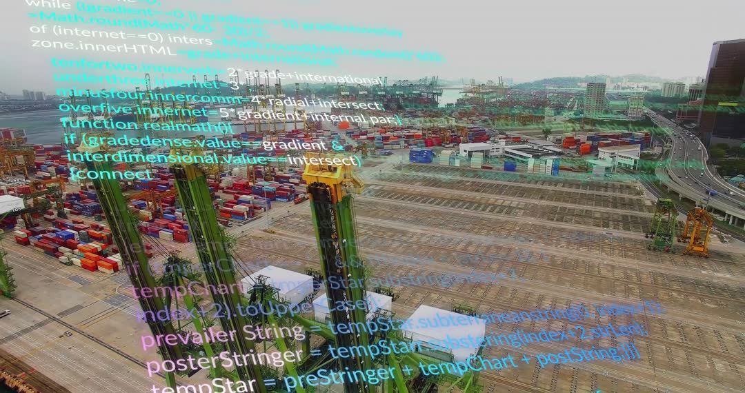 - Drone Arrival at Dawn Revealing Gantry Cranes with Code Overlay