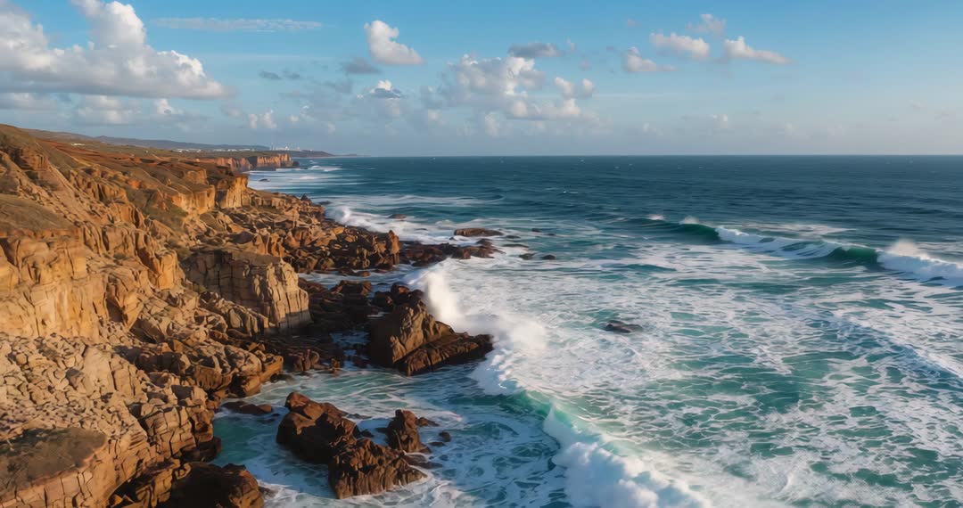 AI Generated Image. This video frame captured by a drone showcases dramatic waves crashing against rugged rocky cliffs during the early morning, under a partly cloudy sky. It highlights the raw power and natural beauty of coastal environments, making it perfect for travel promotions, nature documentaries, background footage for ocean conservation efforts, and relaxation content focused on soothing ocean sounds.