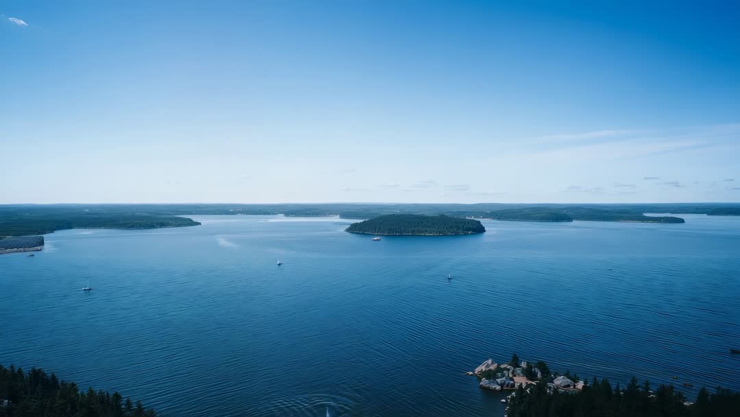 AI Generated Image. Drone camera is sweeping across wide coastal bay, revealing tree-covered island at center and boat wakes tracing gentle arcs on deep blue water. Crisp blue sky is meeting distant horizon, small sailboats are dotting scene, rocky shoreline and pine forest are visible in foreground. Footage is offering calm, expansive seascape mood with strong horizontal composition and natural color palette. Usage ideas: Use for travel promo, tourism commercial, nature documentary, environmental campaign, website hero banner, aerial montage, background for presentations, social media reel, or broadcast opener. Suitable for vacation brochures, boat charter ads, coastal real estate listings, wellness and meditation content seeking serene visuals. Technical notes: Slow pans and gentle zooms are working well to preserve tranquil mood; color grading toward cool blues is enhancing sense of depth; lower-third graphics or text overlays are fitting into sky area while preserving composition. Vertical crop is working for social reels while full-frame landscape is ideal for hero footage and widescreen edits.