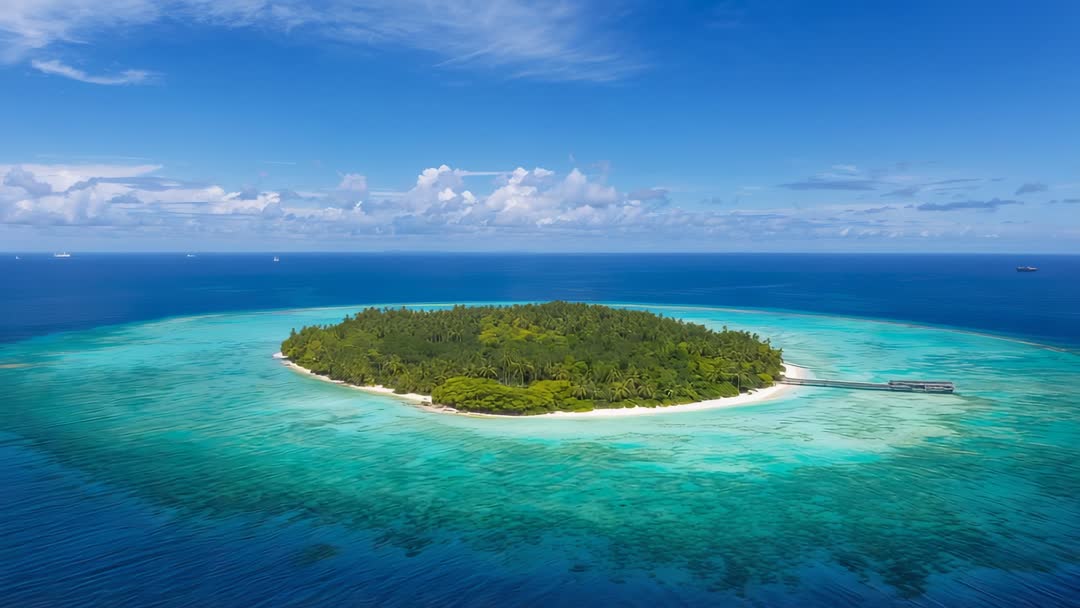 AI Generated Video. Drone circling tropical atoll, revealing turquoise lagoon, white sand coastline, dense palm canopy and coral reef. Pier extending from shoreline into shallow reef, providing scale and arrival point. Wide panoramic motion capturing color gradients from deep navy ocean to pale aqua lagoon. Sunlight glinting on water, creating sparkling highlights across reef and sand. Footage ideal for travel and tourism promos, resort and hospitality marketing, airline or cruise campaigns, social media reels and website hero backgrounds. Also useful for environmental documentaries, coral conservation storytelling, real estate promotions for private island retreats, and stock footage libraries. Easy to crop for widescreen banners, slow-motion sequences, aerial transitions and drone intro shots.