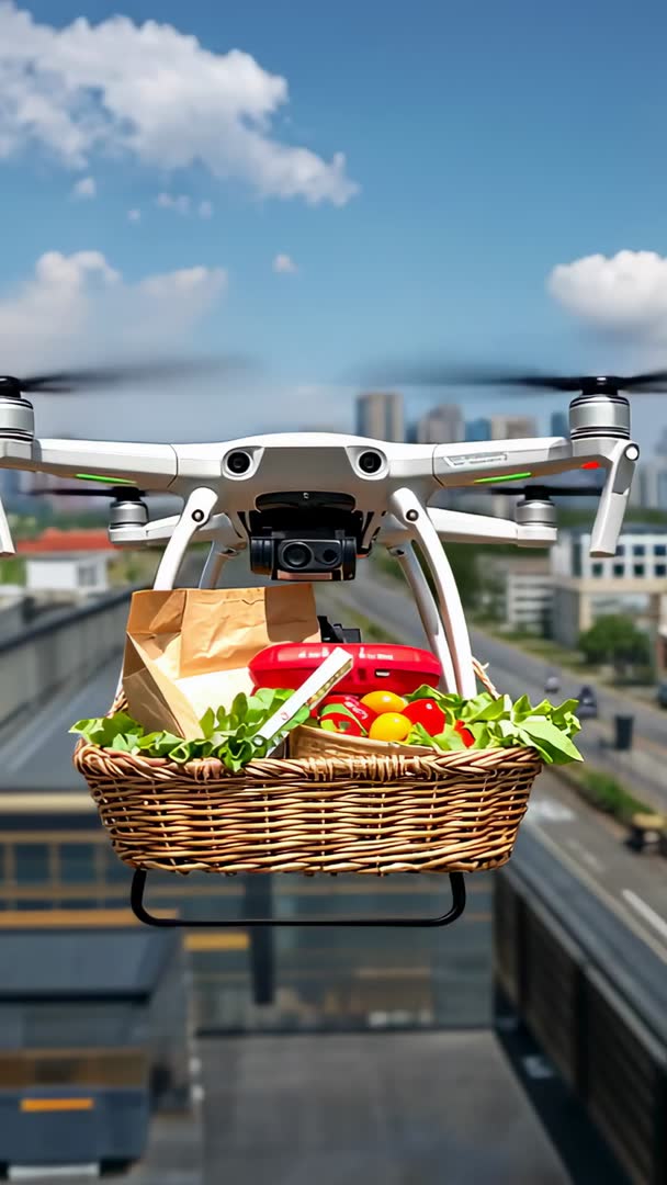 AI Generated Video. Drone hovering over rooftop, carrying wicker basket packed with paper bag, fresh fruits, salad greens, and picnic items. Rotors spinning with motion blur while gimbal camera facing forward, creating cinematic close-up of cargo. Urban skyline and blurred city blocks forming soft background, emphasizing height and movement. Vertical video orientation optimized for mobile viewing and social reels. Working well for advertising drone delivery services, promoting grocery delivery apps, illustrating last-mile logistics, and showcasing contactless food and parcel transport. Suitable for hero banners, app store previews, social media reels, digital ads, pitch decks, and tech startup promos. Colorful composition and clear subject focus providing strong visual hook for thumbnails and vertical ad creative.