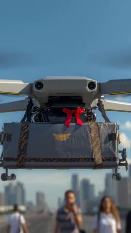 AI Generated Video. Close-up low-angle vertical video showing quadcopter hovering while carrying wrapped gift tied with red bow over urban avenue with blurred pedestrians and skyline background. Featuring visible cargo bay, branded emblem, landing gear and realistic rotor blur for authentic motion. Suitable for commercials, social media ads, technology presentations, ecommerce campaigns, holiday promotions, logistics and delivery concept pieces. Use as hero clip for mobile landing pages, vertical ad units, Instagram Reels, TikTok, Snapchat or app store preview. Editing suggestions include adding subtle motion blur, cinematic color grade, upbeat electronic or orchestral soundtrack, lower-third text overlays and animated logo reveal for stronger branding. Ideal for illustrating last-mile delivery, contactless delivery, drone logistics, smart city innovation or futuristic urban transport narratives.