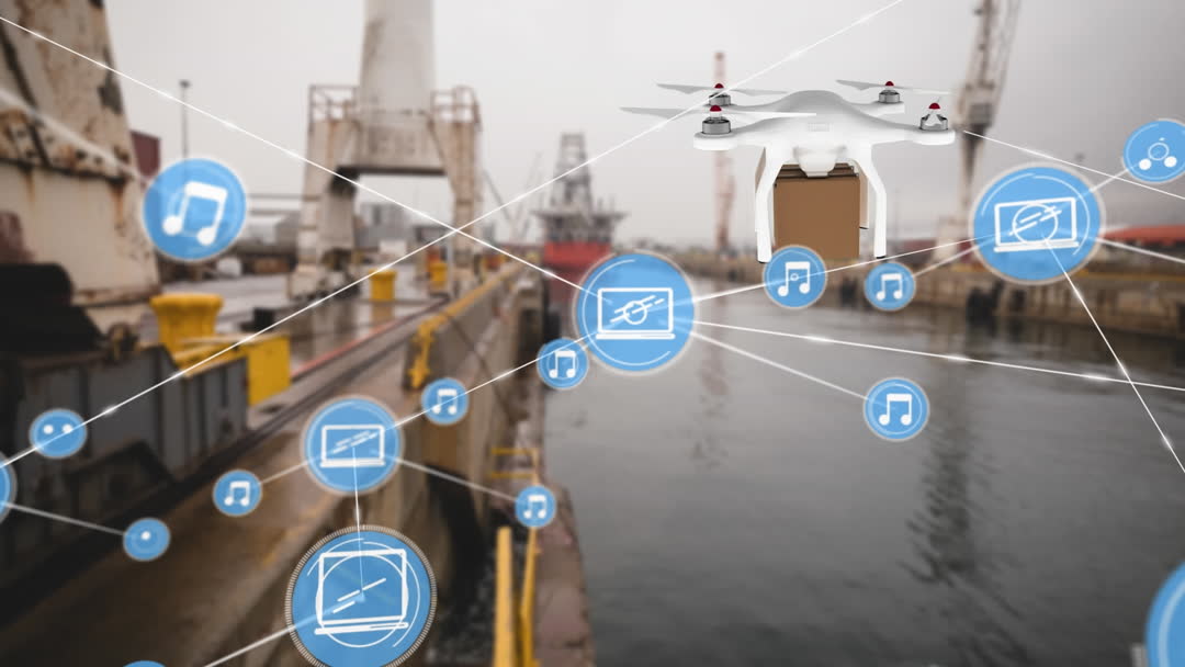 - Drone Delivery with IoT Network Icons at Industrial Port