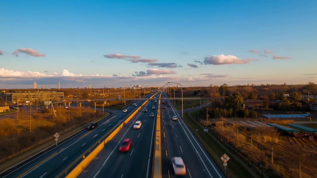 AI Generated Image. High-angle drone footage capturing multilane highway stretching toward vanishing point during golden hour. Smooth motion blur conveying vehicle speed while warm light casting long shadows across suburban landscape. Footage tailored for transportation studies, traffic monitoring, urban planning, logistics promotion, and news packages. Useful for website hero banners, social media ads, corporate presentations, safety campaigns, and documentary sequences. Editing suggestions: apply color grading to enhance golden tones, add subtle stabilized zoom for dramatic reveal, overlay headline text and animated data graphics for traffic reports or infrastructure case studies.