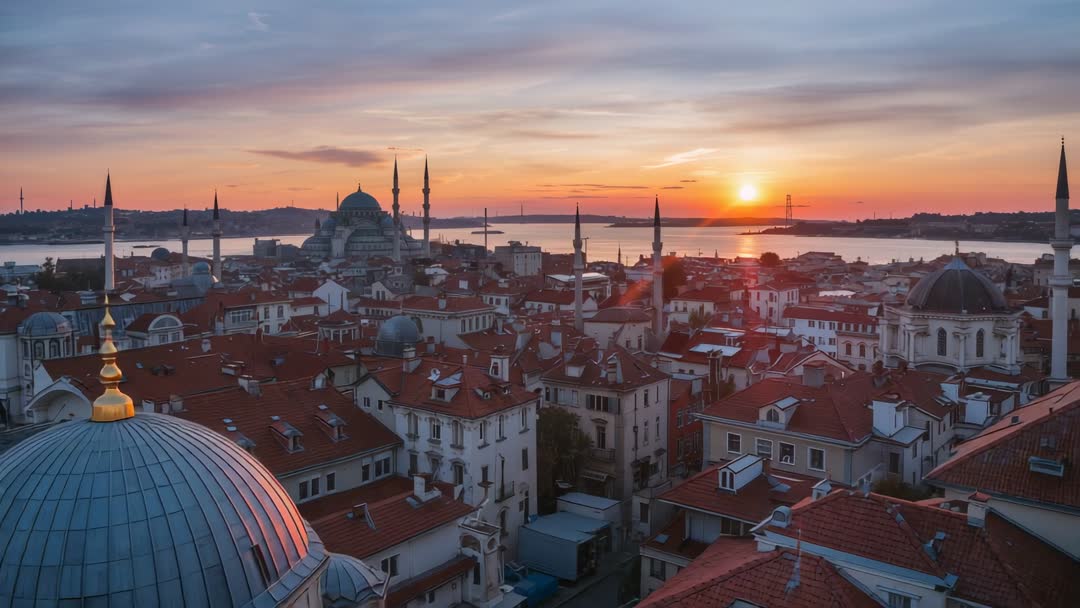 AI Generated Image. Drone footage filming sunrise over Istanbul waterfront, capturing warm light spreading across red rooftops, historic domes and tall minarets, sun reflecting on Bosphorus strait. Camera performing slow gliding sweep from foreground dome toward distant imperial mosque and horizon, revealing layered cityscape and harbor silhouette under pastel sky. Color palette featuring golden hour oranges, soft pinks and cool blues, dramatic contrast between illuminated rooftops and shadowed alleys. Ideal for travel and tourism promos, city guides, documentary openers, cultural heritage pieces, architecture features, website hero backgrounds, social media reels and broadcast news segments. Use as opener for video essays about Ottoman architecture, time-lapse sequences or aerial montage in commercial ads. Compatible with 4K editing, works well with slow motion, cinematic crop and text overlay for title cards. Licensing suggestions include editorial coverage of Istanbul, commercial campaigns highlighting historic waterfront, and lifestyle branding focused on urban travel.