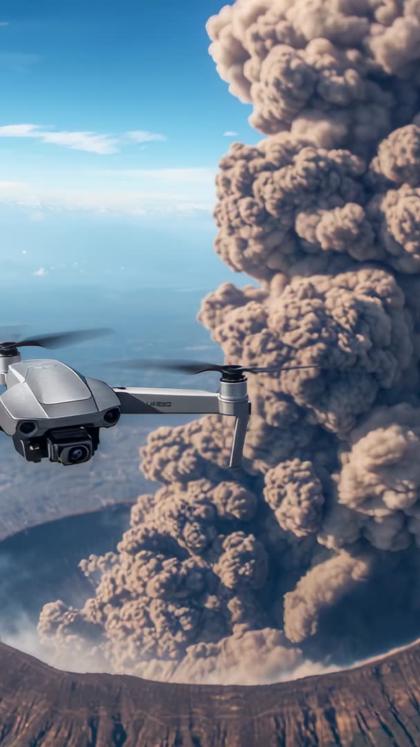 AI Generated Image. Showing drone-mounted gimbal capturing volcanic eruption from crater rim, with towering ash plume rising into sky. Vertical frame composing drone near foreground and massive ash column over crater in background, leaving ample left-side copy space for title, logo, lower-third text. Offering cinematic motion and high-altitude perspective ideal for breaking news segments, documentary features, emergency response briefings, hazard monitoring, scientific outreach, travel advisories, and environmental storytelling. Working well as opener for broadcast packages, social media reels, mobile vertical ads, and educational clips. Suggest applying warm contrast grade to accentuate ash texture, adding subtle stabilization and gentle speed ramps for dramatic emphasis. Including metadata for location, date, and safety notes to support editorial use and licensing.
