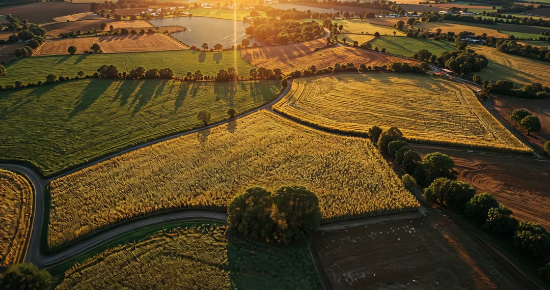 AI Generated Image. Captured from a drone at sunset, the expansive wheat fields and curving hedgerows beneath reveal the tranquility and natural beauty of the countryside. The golden glow of the setting sun adds to the scene's cinematic quality. Ideal for projects related to agriculture, rural leisure activities, travel documentaries, or evocative visuals for calming and relaxation media.
