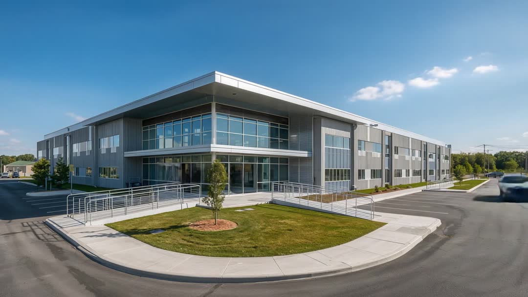 AI Generated Image. Wide aerial footage showcasing modern two-story office building in suburban business park, featuring expansive glass facade, metal cladding, entrance canopy, accessible ramp, and landscaped lawn. Camera panning across entrance while car briefly entering frame, creating natural motion and contextual scale. Footage offering clean daytime lighting, blue sky backdrop, and smooth camera movement, ideal for hero banners, background loops, or title sequences. Use cases include showcasing property for commercial real estate listings, enhancing corporate website hero loops, powering architecture firm showreels, supporting investor pitch videos, illustrating accessibility and site planning, and complementing marketing materials and presentation backdrops. Technical notes: captured in high resolution, crop-safe for widescreen formats, supporting color grading and motion graphics overlays, and compatible with ambient corporate soundtrack.