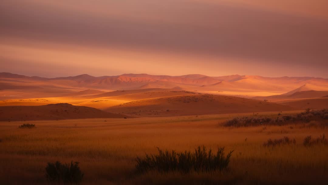 - Drone footage capturing sunlight sweeping across golden steppe and distant dunes at sunset