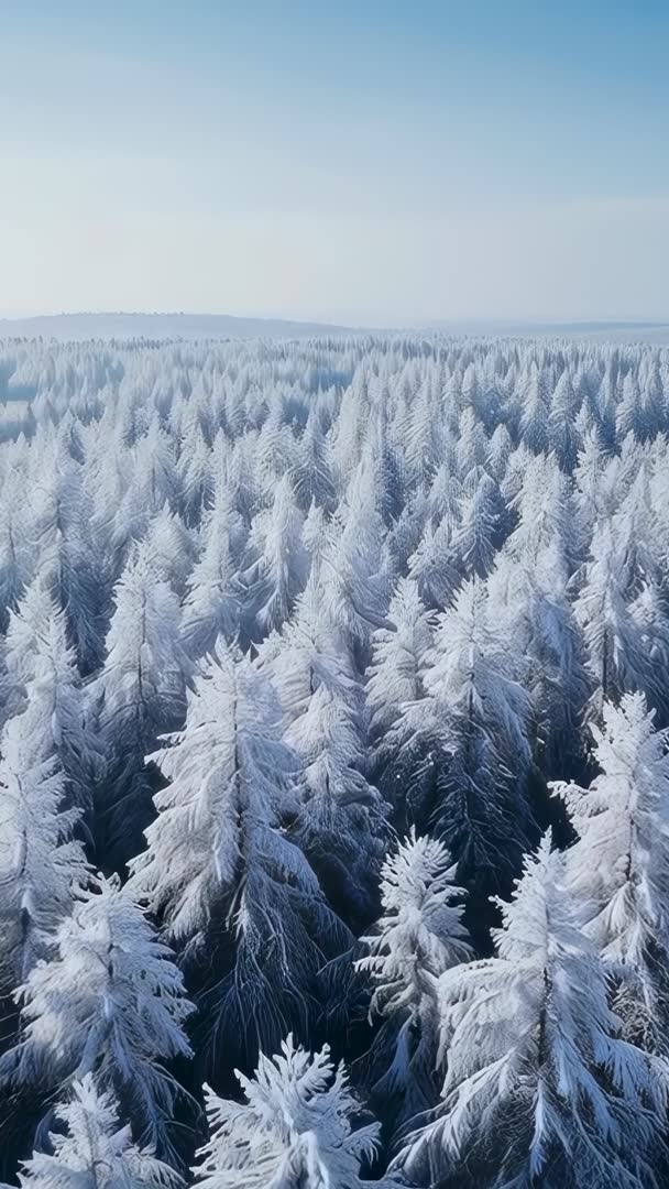 AI Generated Video. Drone gliding forward and descending over frosted taiga canopy. Snow-dusted evergreen trees stretching to horizon, soft cold light creating pale blue palette and detailed branch textures. Movement providing smooth parallax for seamless title reveals and slow cinematic transitions. Ideal for hero background for winter tourism, outdoor adventure promos, climate and conservation features, seasonal marketing and holiday campaigns. Useful as cinematic opener, ambient loop, social media vertical reel, stock B-roll, website header, mobile wallpaper. Color grading flexibility allowing emphasis on cool tones or warm sunlight contrast for mood variation.