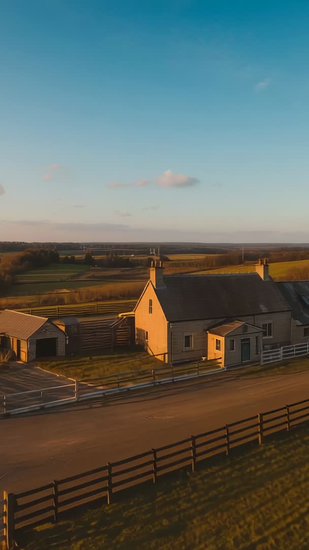 AI Generated Image. Showing vertical drone pan over farmhouse, barn and outbuildings beside country road, sweeping across rolling fields at golden hour. Capturing warm late afternoon light, long shadows and textured farmland for cinematic storytelling. Leaving ample negative space in sky for title cards, logos or text overlays. Working well for agricultural marketing, rural tourism promos, real estate reels, environmental features and social media vertical ads. Providing steady aerial motion and wide landscape composition for use in video intros, website headers, broadcast spots and mobile-first content.