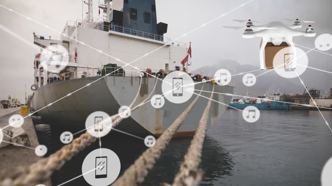 Large ship moored in port with drone carrying package symbolizing modern delivery systems. Digital overlays depict technological connectivity in global shipping operations. Use in articles or advertisements about logistics innovation, technological advancements in shipping, or modern transportation solutions influencing international trade dynamics.