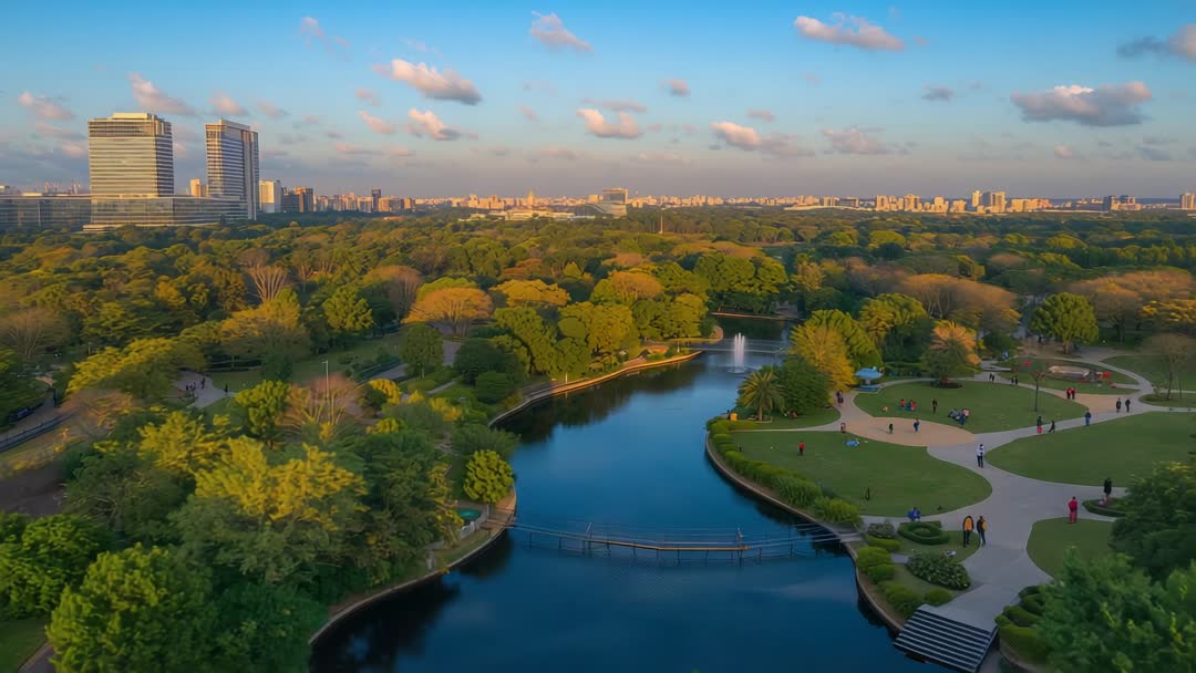 AI Generated Image. Video showing drone lowering over expansive urban park at dusk, revealing winding pond with central fountain and curving walkways populated by visitors in light outerwear. Golden hour light casting warm tones across treetops and lawns while city skyline appears on horizon, providing contrast between nature and urban life. Composition providing smooth aerial movement and natural soundscape for use as atmospheric intro or background. Ideal uses include website hero banners, tourism and destination promos, city park guides, real estate development reels, corporate sustainability or lifestyle videos, social media reels, and broadcast establishing shots. Editing suggestions: loop short clip for calming backgrounds, add soft ambient music for wellness content, or pair with voiceover for travel narration. Color grade recommendations: enhance warm highlights and maintain natural greens for inviting, cinematic feel.