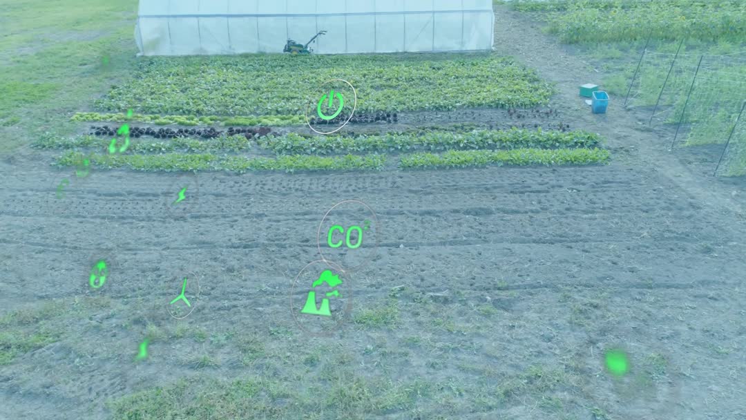 Drone captures sustainable farming area with overlay of eco-technology indicators such as CO monitoring near greenhouse. Ideal for presentations or articles focused on agricultural innovation and environmental conservation practices. Highlights integration of technology and traditional farming illustrating harmony between ecology, technology, and efficient land use.