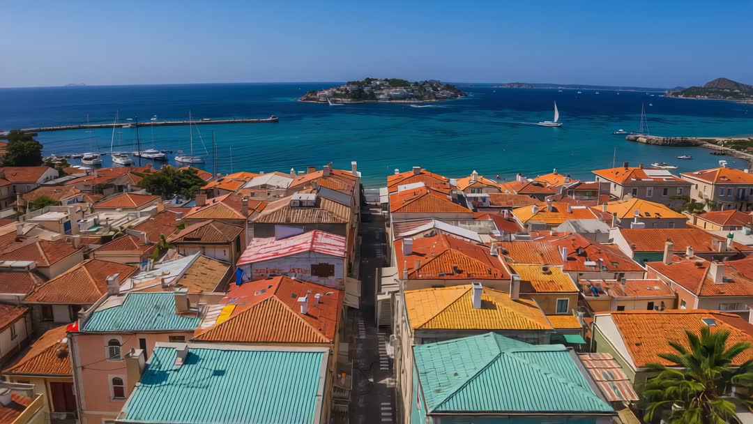 AI Generated Image. High-resolution aerial clip capturing drone moving forward over colorful Mediterranean rooftops, revealing narrow street leading toward marina and small islet in turquoise sea. Vibrant terracotta and pastel roofs creating repeating patterns and strong leading lines, enhancing sense of depth and movement. Warm sunlight highlighting roof textures and clear blue water, evoking relaxed holiday mood and coastal lifestyle. Ideal for travel videos, tourism promotion, destination marketing, real estate showcases, lifestyle vlogs, and cinematic openers. Suitable for website banners, social media ads, broadcast promos, corporate presentations, and stock footage libraries. Use as establishing shot, background for titles, or loopable aerial pan. Editing suggestions: color grading for boosted blue-orange contrast, cropping for 16:9 or vertical formats, adding subtle stabilized reveal for smooth motion.