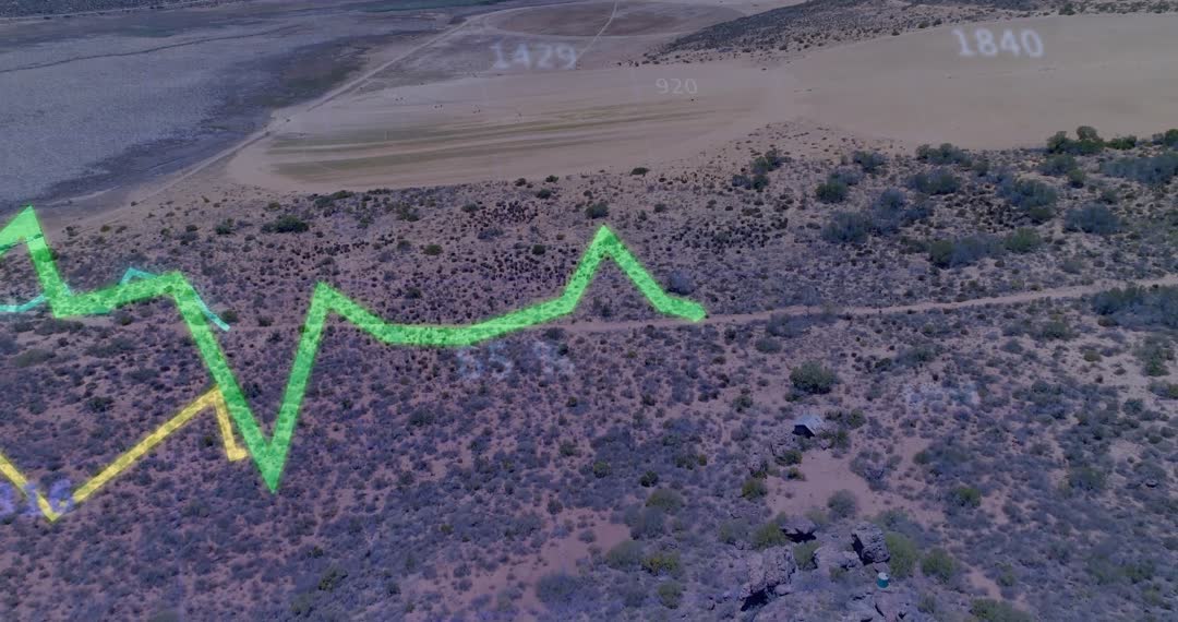- Drone Over Rocky Desert Fusing Real-Time Data Visualizations