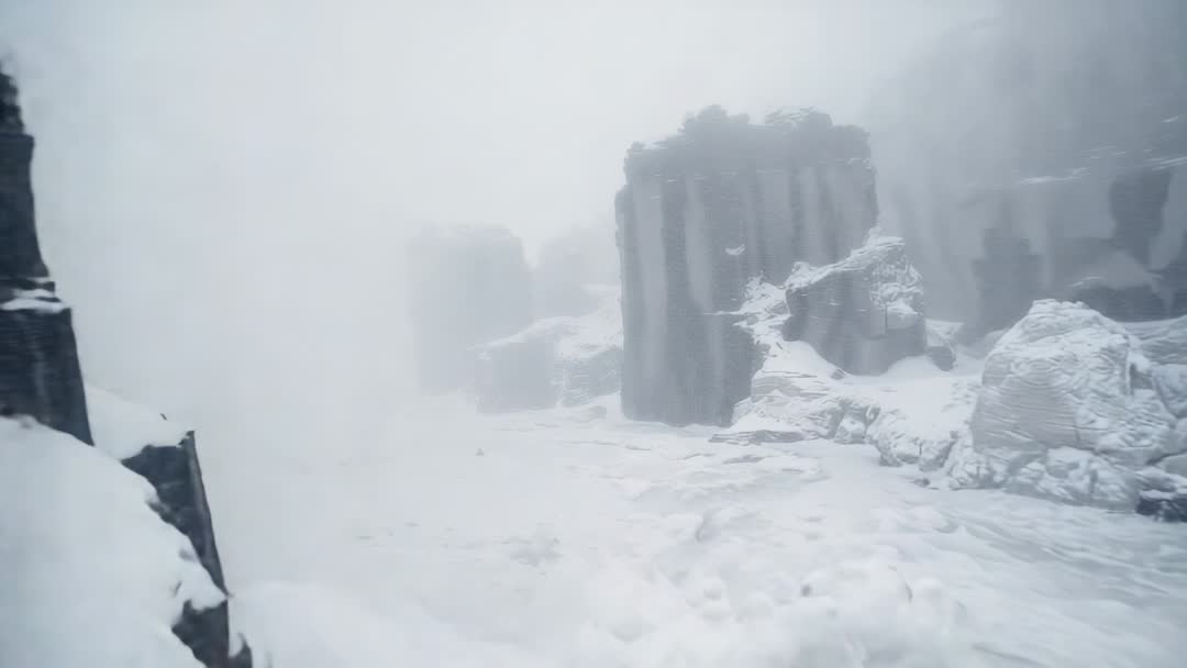 AI Generated Video. Drone panning across snowy canyon, revealing towering basalt monoliths and wind-swept plateaus while thick fog drifting through narrow gorge. Frost and sculpted rock textures emphasizing dramatic contrast, with boulder entering frame during final reveal. Suitable for cinematic opener, nature documentary sequence, travel promotion, climate story, background for title overlays, stock footage for advertising, or concept for game environment. Recommended editing ideas: gentle color grading toward cool blue tones, slow-motion or subtle speed ramp for added drama, adding ambient wind sound or orchestral sting, inserting lower-third text on clear sky area. Delivering strong visual themes of isolation, harsh weather, geology, and remote wilderness for broadcast, online video, social media, or editorial use.