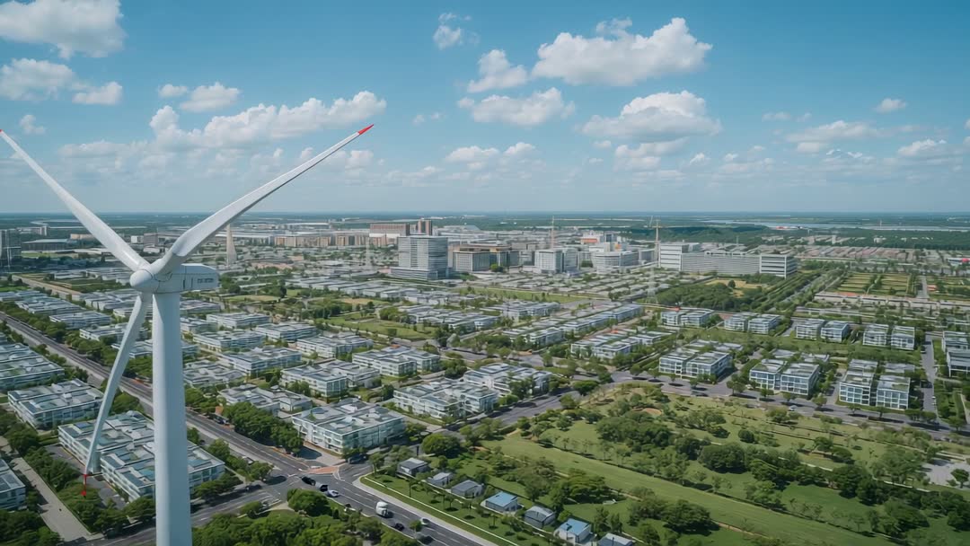 AI Generated Image. Wide aerial pullback revealing rotating wind turbine dominating foreground while suburban energy grid of low-rise office blocks and tree-lined streets stretches toward distant corporate campus under blue sky. Clean midday light and scattered clouds creating high-contrast visuals and strong copy space over upper third of frame for on-screen headlines or logo placement. Use for corporate sustainability video opener, renewable energy campaign, urban planning presentation, annual report motion graphics, website hero background, documentary b-roll, investor pitch decks, or social media promotion. Edit suggestions: apply gentle slow-motion on turbine blades, add lower-third data overlays showing energy metrics, insert map transitions to connect local grid to regional network. Frame aspect 16:9, drone pullback movement creating cinematic reveal, ideal for brand storytelling around transition to clean energy and modern infrastructure.