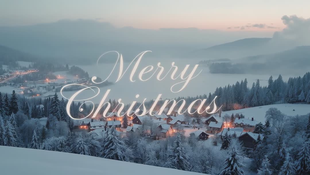 AI Generated Video. Camera pulling back over snowy village, revealing elegant Merry Christmas script floating above rooftops. Warm house lights glowing through frost-covered pines, fog rolling across valley at dawn, pastel sky adding soft color. Footage fitting holiday greeting videos, social media reels, website hero backgrounds, digital card animations, retail and in-store screens, TV or streaming commercial openers. Editors finding easy space for replacing text, adding logo, or extending clip with slower aerial reveal for longer cut. Recommended using soft piano or orchestral soundtrack, subtle snowfall particle layer, slow crossfade for seamless loop. Footage delivering cozy, nostalgic mood for seasonal campaigns, greeting cards, event invites, and festive branding.