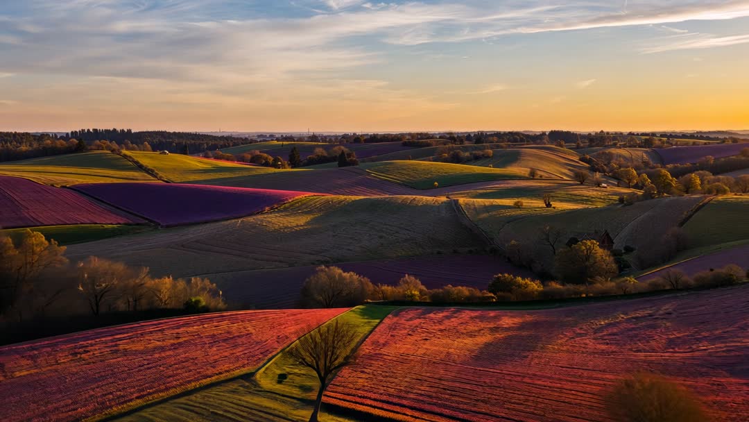 AI Generated Image. Drone footage showing patchwork farmland at golden hour, warm sunlight casting long shadows across rolling hills and highlighting contrasting bands of magenta and green. Forward-moving camera revealing solitary tree atop narrow grassy track, hedgerows and furrows creating rhythmic lines across frame. Composition balancing near-field texture with distant ridgelines, providing cinematic depth and strong color contrast. Colors and motion suiting use in travel promos, agricultural features, environmental storytelling, background loops for websites, social media reels, or cinematic openers. Technical notes: smooth glide motion, wide panoramic framing, slow parallax between foreground and horizon, ideal for 4K timelines and motion graphics overlays.