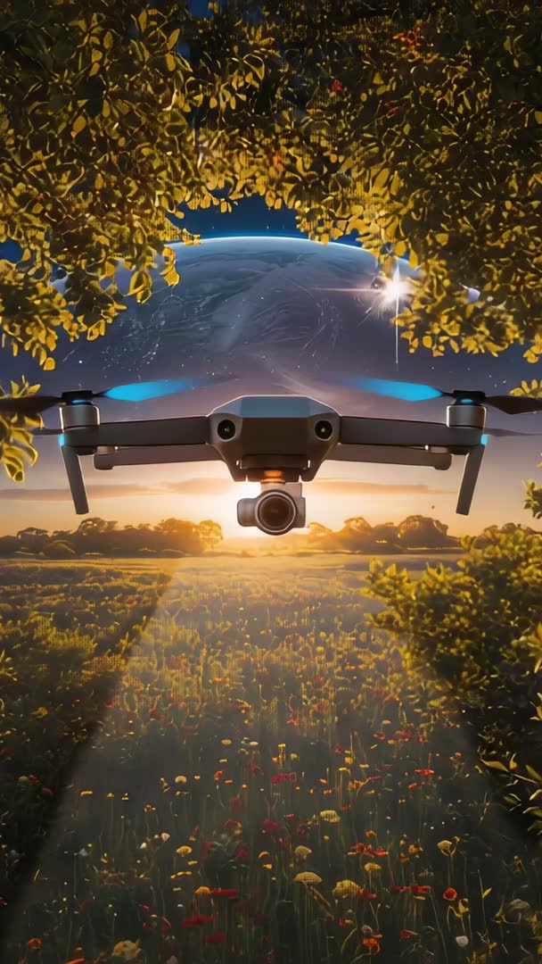 AI Generated Image. Showing quadcopter with gimbal scanning wildflower meadow at dawn while distant planet rises over horizon. Vertical composition emphasizing foreground blooms, midground drone, background celestial sphere and warm sunrise glow. Camera framing placing drone center-frame and leading lines drawing eye along sunlit path through meadow. Use for sci-fi trailers, technology commercials, travel or nature promotions, environmental campaigns, social media reels and app intros. Combine with ambient soundtrack and subtle color grade to enhance cinematic mood. Add lower third for branding, speed ramping for dramatic reveal, and crop for platform-specific delivery. Technical notes: 9:16 vertical format, cinematic color contrast, soft backlight with lens flare. Suitable for stock libraries, promotional videos, editorial pieces, website hero backgrounds.