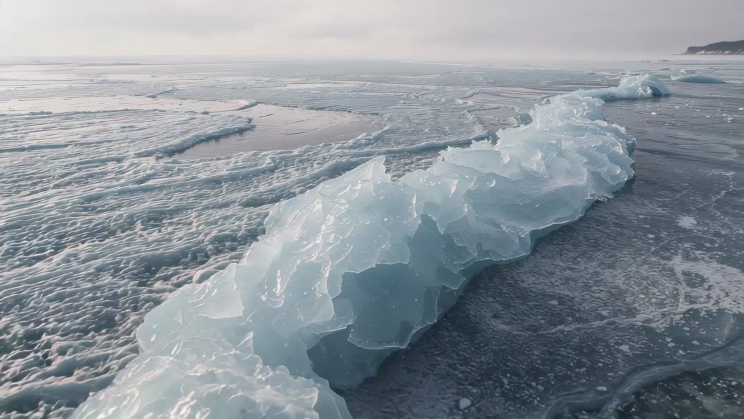 AI Generated Video. Drone footage showing long translucent blue ice ridge extending along frozen coastline, revealing layered crystalline texture and soft light reflections. Low-altitude aerial movement traveling parallel to ridge, offering dramatic foreground detail and distant horizon line. Color palette featuring cool blues, pale grays, muted whites, creating calm minimalist mood and cinematic atmosphere. Footage fitting for climate change documentaries, nature and travel videos, environmental reports, scientific presentations, corporate backgrounds, website hero banners, social media reels, and desktop or broadcast wallpapers. Editors using slow pans, subtle zooms, crossfades, or timelapse overlays to emphasize scale and seasonal variation. Licensing suitable for editorial storytelling, commercial tourism promotion, environmental campaigns, and large-format display use.