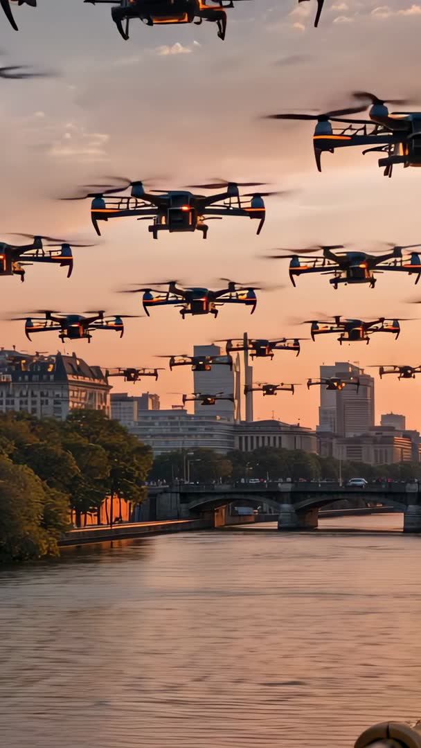 AI Generated Video. Vertical footage showing large drone swarm approaching camera over river during golden hour. Multiple quadcopters flying in coordinated formation above urban skyline and bridge while sunset light is casting warm reflections on water. Foreground featuring rope knot on railing for anchored perspective and added depth. Scene conveying futuristic urban mobility, autonomous delivery fleet, and smart city choreography. Clip working well for tech commercials, sci-fi openers, urban mobility presentations, newsroom B-roll, UAV product promos, and social media vertical ads. Recommended edits including cinematic color grading, applying slight slow motion for dramatic emphasis, and adding lower-third text overlay for messaging. Ideal for 9:16 projects including Instagram Reels, TikTok, Snapchat Spotlight, and mobile ad campaigns. Usage examples: concept piece for drone logistics, smart city innovation feature, emergency response simulation, or visual effects reference for VFX artists.