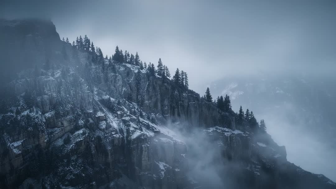 AI Generated Video. Showing cinematic drone footage of fog drifting across rugged alpine ridge, revealing pine silhouettes and scattered snow patches. Working well for nature documentaries, travel films, outdoor adventure promos, and environmental storytelling. Featuring slow camera sweep, cool blue toning, soft light diffusion, and high vantage point that emphasize scale and isolation. Adding title overlays, placing lower-third captions, looping for hero background on websites, or using as moody b-roll in film and TV. Pairing with ambient music, narration, or weather data graphics for immersive feel. Suitable for editorial spreads, magazine covers, marketing for winter travel and outdoor gear, and background for mindfulness or ambient video projects.