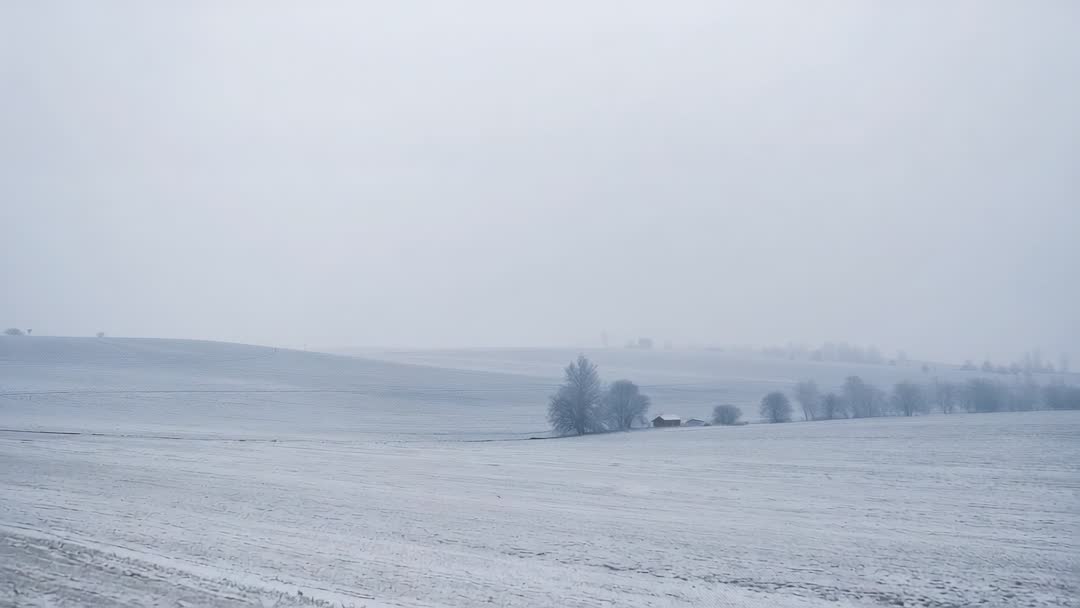 AI Generated Video. Footage showing wide snow-covered fields stretching into misty horizon, isolated cluster of trees and small farm buildings punctuating muted landscape. Soft haze and cool blue tones creating calm, minimalist mood. Slow left-to-right pan or gentle forward push working well for establishing shot, background for seasonal websites, travel films, weather segments, or editorial pieces on rural life. Using ambient piano or wind sound enhancing atmospheric feel. Ample negative space providing room for headline text or lower-third graphics. Recommendations for use include color-grading to warmer or colder palette depending on campaign, adding subtle film grain for texture, and trimming to short loops for social media banners, calming meditation backdrops, or real estate seasonal promotions.