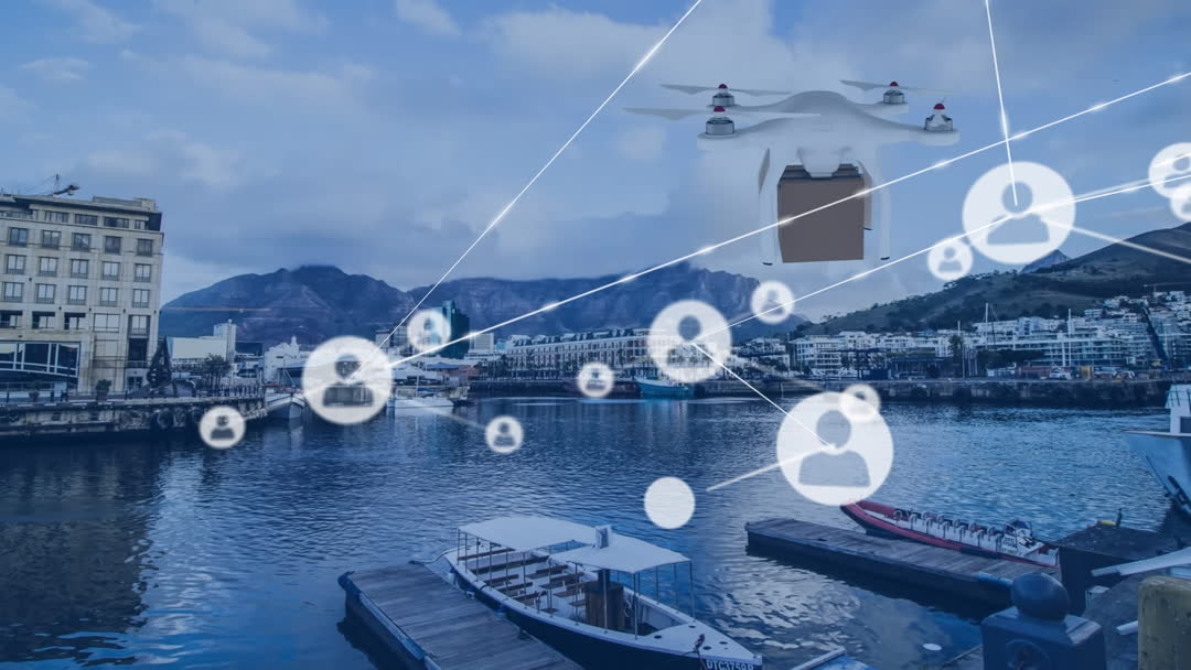 Image depicts a futuristic scene showing a drone flying over a harbor, amidst interconnected profile icons. The background highlights a city's waterfront, illustrating modern shipping concepts and digital network technology. This concept art could be useful for themes involving digital transformation in urban environments, logistics innovations, surveillance technology, or discussions related to the Internet of Things (IoT).