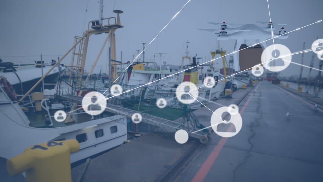 Visual combines modern delivery technology with connectivity network in bustling port environment, ideal for illustrating concepts related to smart logistics, digital communication systems, and the implementation of drones in freight transport and maritime industries.