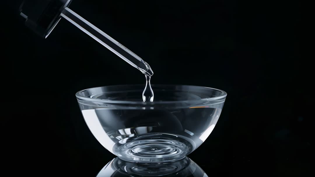AI Generated Image. Showing droplet forming from glass pipette and detaching into glass bowl, creating concentric ripples and crisp specular reflections on black background. Providing macro close-up highlighting surface tension, clarity, and fluid motion for scientific and commercial use. Serving skincare and cosmetic product ads, serum dropper demonstrations, laboratory and science content, pharmaceutical packaging, clean beauty branding, and minimalist website hero banners. Working well as loopable slow-motion clip for social media reels, TV spots, product commercials, explainer videos, and educational animations. Recommending slow-motion playback, looping around splash moment, cropping for vertical formats for mobile ads, and adding subtle ambient music with minimal text overlays. Suggesting color grading with cool neutral tones for clinical look or warm accents for beauty branding. Delivering high-contrast, high-resolution footage for print and web; offering alpha matte for easy compositing.